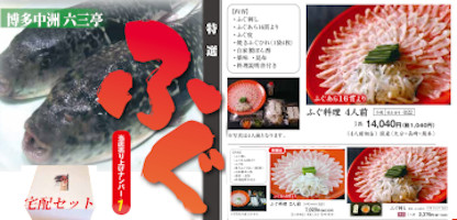 ふぐ・クエコース(ご予約をお願いします) ■虎河豚 Aコース 6,300円 ・小鉢、ふぐ刺し、唐揚げ、ちり鍋、雑炊、デザート ■虎河豚 Bコース 虎河豚白子焼付き 8800円 ・小鉢、ふぐ刺し、白子焼き、唐揚げ、ちり鍋、雑炊、デザート ◆クエ本あらコース ◆クエしゃぶ鍋 ふぐ、クエご予約の際は、コースの名称を伝えて頂けるとスムーズです六三亭の博多ふぐセット宅配 |